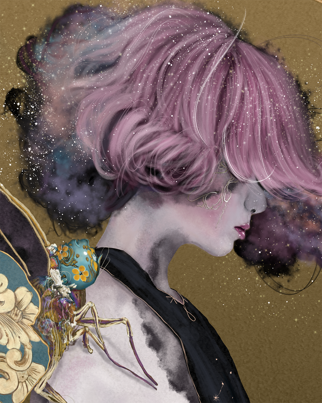 Medium: "Giclée" of digital painting, printed with pigment inks, created from a blank canvas, painted using a Wacom Intuos Pro M (2017) drawing tablet, in Adobe Photoshop, on Grut Brushes Bellstone Art Surface, subsequently hand-embellished with Austrian crystals and acrylic iridescent medium