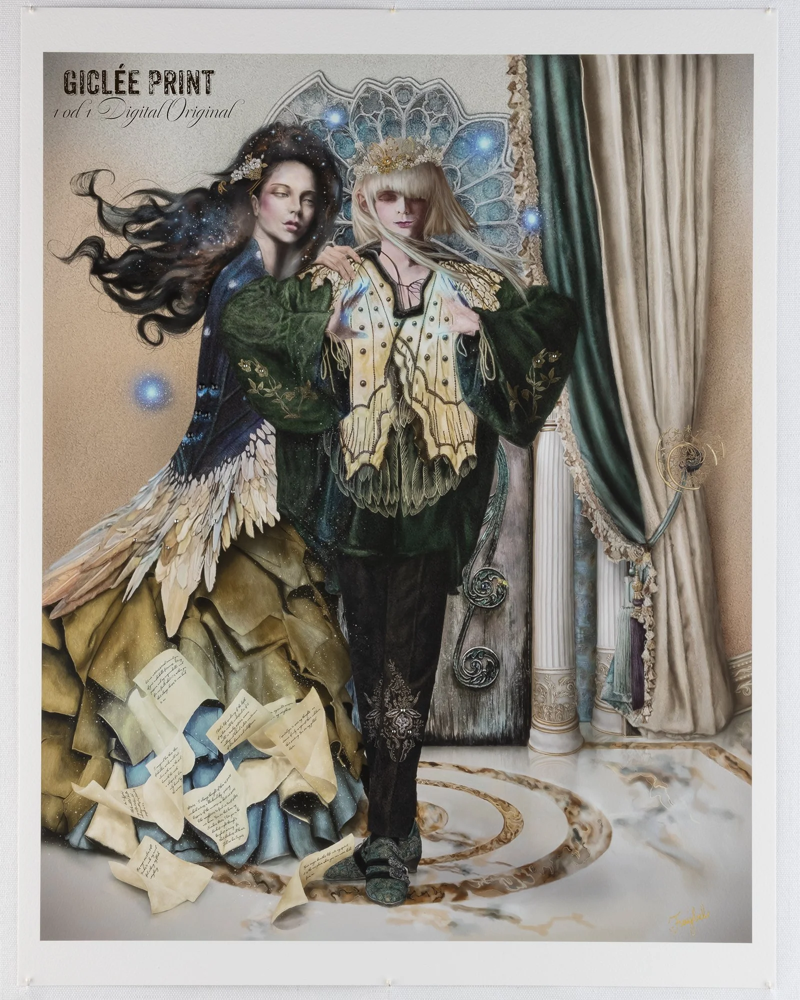 This digital original giclée signed by the artist was originally exhibited through Curio Art Gallery. "Gilded Letters" was on display for the online venue's "Penumbra 10 Year Anniversary Dark Art Show", from April 5, 2025- April 30, 2025, It is the fifth illustration from FAYBEL's dark romance fantasy narrative Timbretock: many paintings from this collection have been scheduled for magazine/book publication and are award winning, this piece, recently published in Bold Journey Magazine (online) and Hyperlux Magazine (online), has also been shortlisted (final results pending) for the Women United Art Prize Painting & Drawing Category. In "Gilded Letters", the Alchemist transmutes written correspondence shared between himself and the female main character, Miyako, into gilded leaves of satin in a Cinderella-inspired fairytale moment.