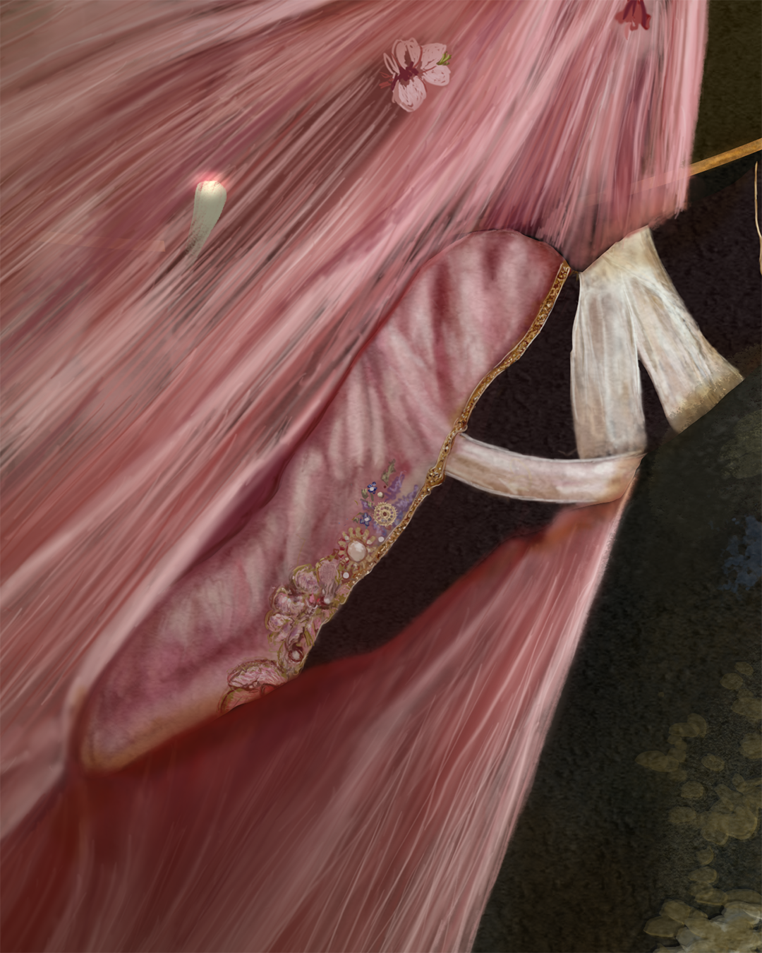 "His magic was slow, soft touches to make my mind feel nothing, my flesh, everything. The dress serenaded my skin: our letters a fabric—their whisperings words disquieted, entangled in the rustle of satin. My embossed scrawl glistened with his penned flourishes, abed on molten parchment that hummed against skin. Each gilded leaf hazed my thoughts—the sensation, an ambrosia that smeared all vision. The crush of silk fastened and belled to a golden gown, caging the cliff notes of our tale within."