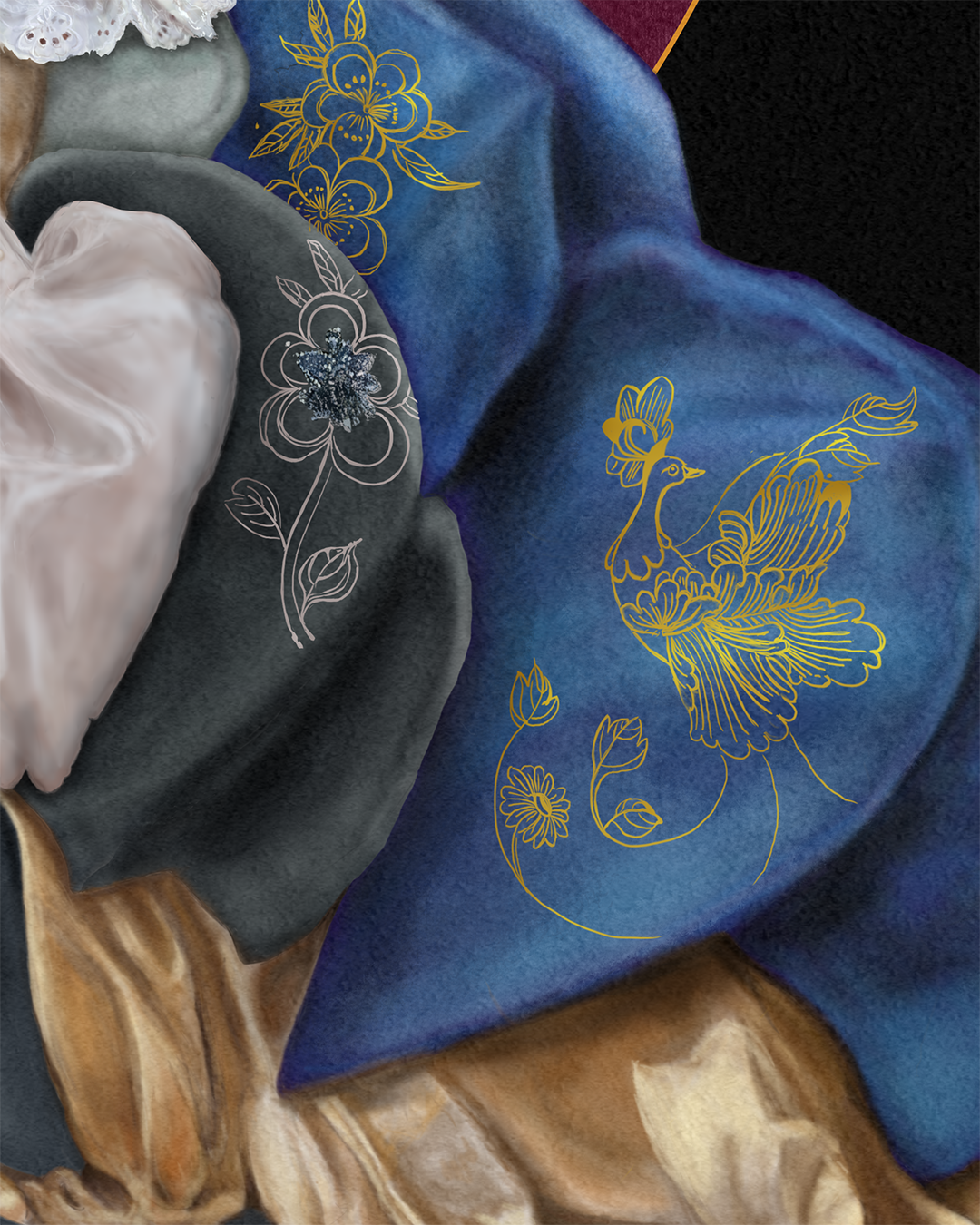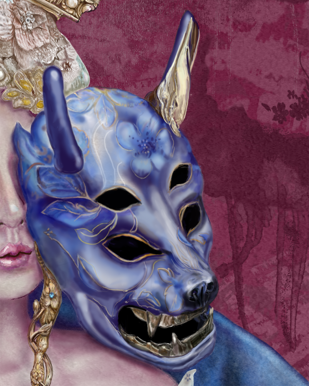 The archetypal wolf from the Grimm Brothers’ recount of Little Red Riding Hood makes its vicious play with Ancient Egyptian motifs and symbology, autumnal fine bone china teacup patterns and mask designs of kitsune, the shapeshifting fox spirits of Japanese folklore, in “Dancing with Wolves”. Inspirational notes from No-Face of Miyazaki’s Spirited Away interplay with references to monochrome illustrations by Rovina Cai from Alix E. Harrow’s Starling House; the Japanese television series The Ancient Magnus’ Bride, adapted from the original manga by Kore Yamazaki; and the traditional oil works of Vanessa Lemen. This piece was fashioned in over hundreds of hours, in the supine position, due to spinal injury, with intent to mimic key visual motifs from my prior works, High Art Competition’s 2025 Top 150, “Many Faces of the Dreamer” and Japanese ink painting (sumi-e) styled “The Never Queen”, a part of Curio Art Gallery’s 2024 group exhibition, "Memoir".