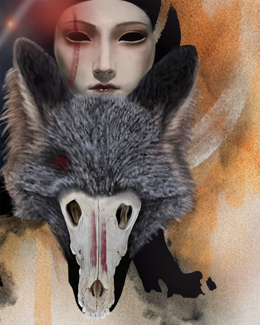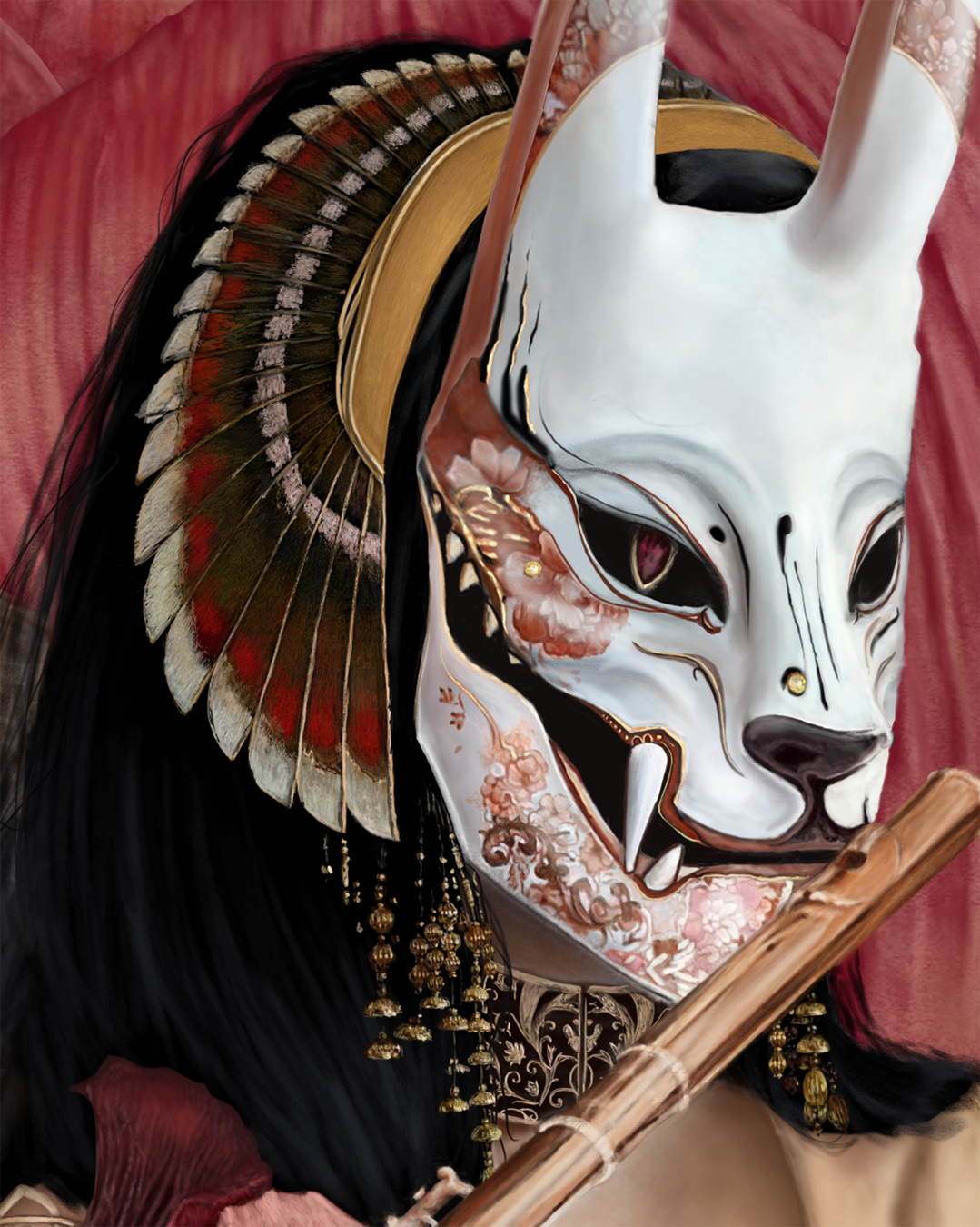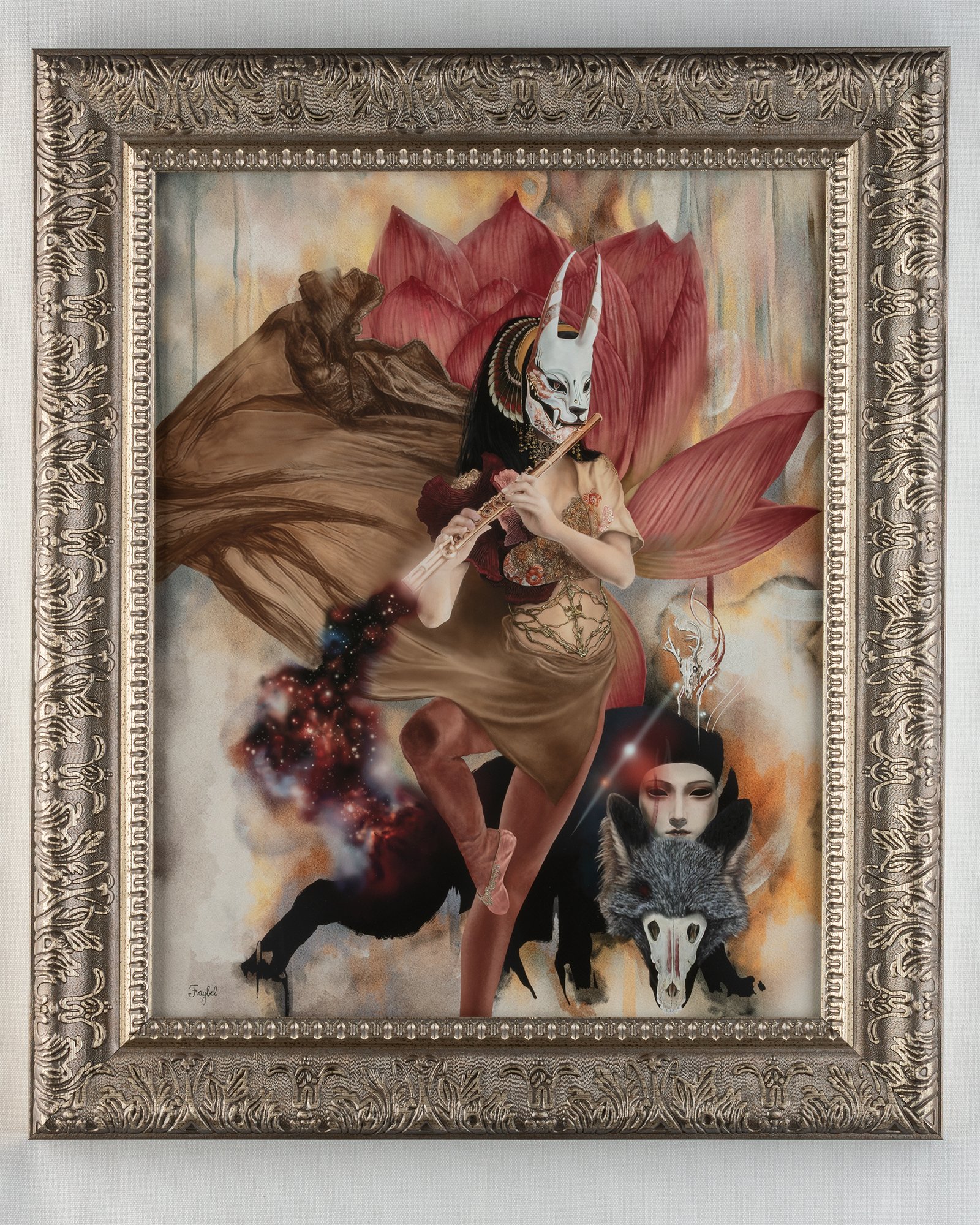 The archetypal wolf from the Grimm Brothers’ recount of Little Red Riding Hood makes its vicious play with Ancient Egyptian motifs and symbology, autumnal fine bone china teacup patterns and mask designs of kitsune, the shapeshifting fox spirits of Japanese folklore, in “Dancing with Wolves”. Inspirational notes from No-Face of Miyazaki’s Spirited Away interplay with references to monochrome illustrations by Rovina Cai from Alix E. Harrow’s Starling House; the Japanese television series The Ancient Magnus’ Bride, adapted from the original manga by Kore Yamazaki; and the traditional oil works of Vanessa Lemen. This piece was fashioned in over hundreds of hours, in the supine position, due to spinal injury, with intent to mimic key visual motifs from my prior works, High Art Competition’s 2025 Top 150, “Many Faces of the Dreamer” and Japanese ink painting (sumi-e) styled “The Never Queen”, a part of Curio Art Gallery’s 2024 group exhibition, "Memoir".