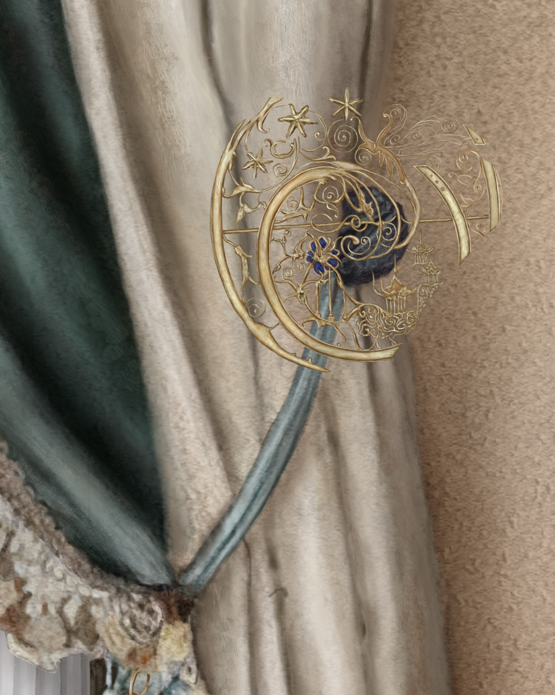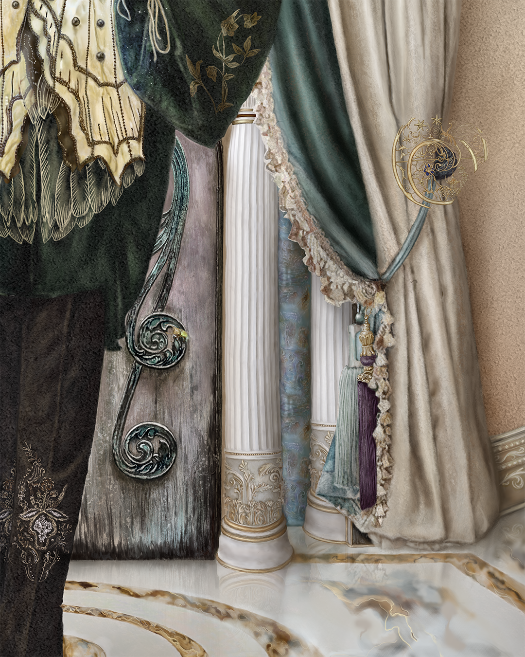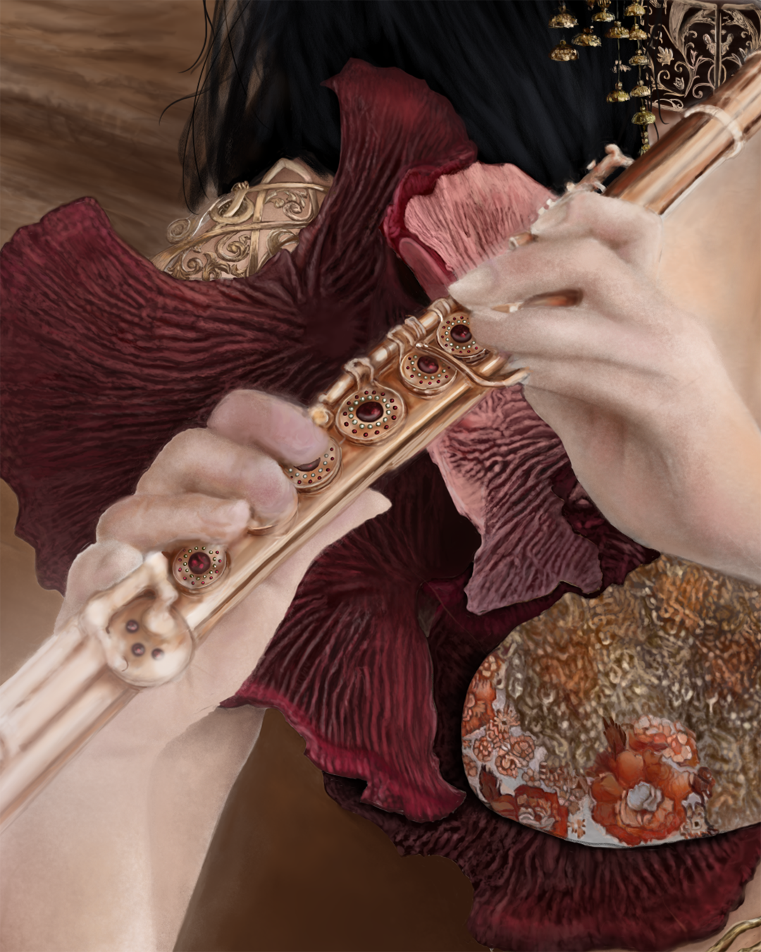 Medium: digital painting, using a UGEE S640 tablet, in Adobe Photoshop, on Grut Brushes Bellstone Art Surface, subsequently hand-embellished with Austrian crystals