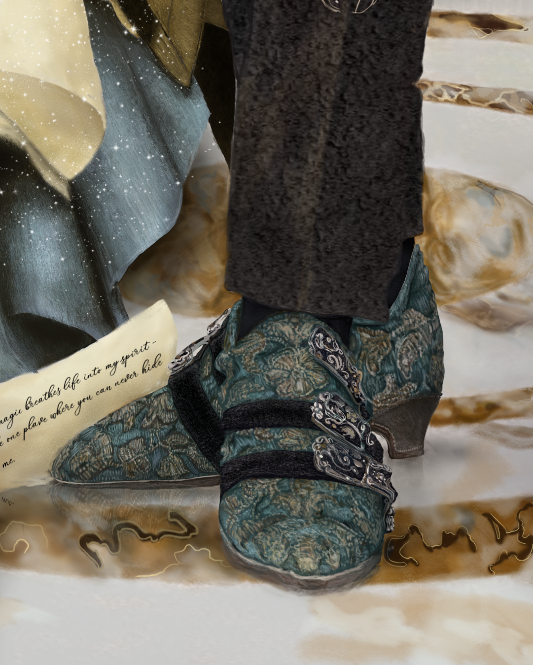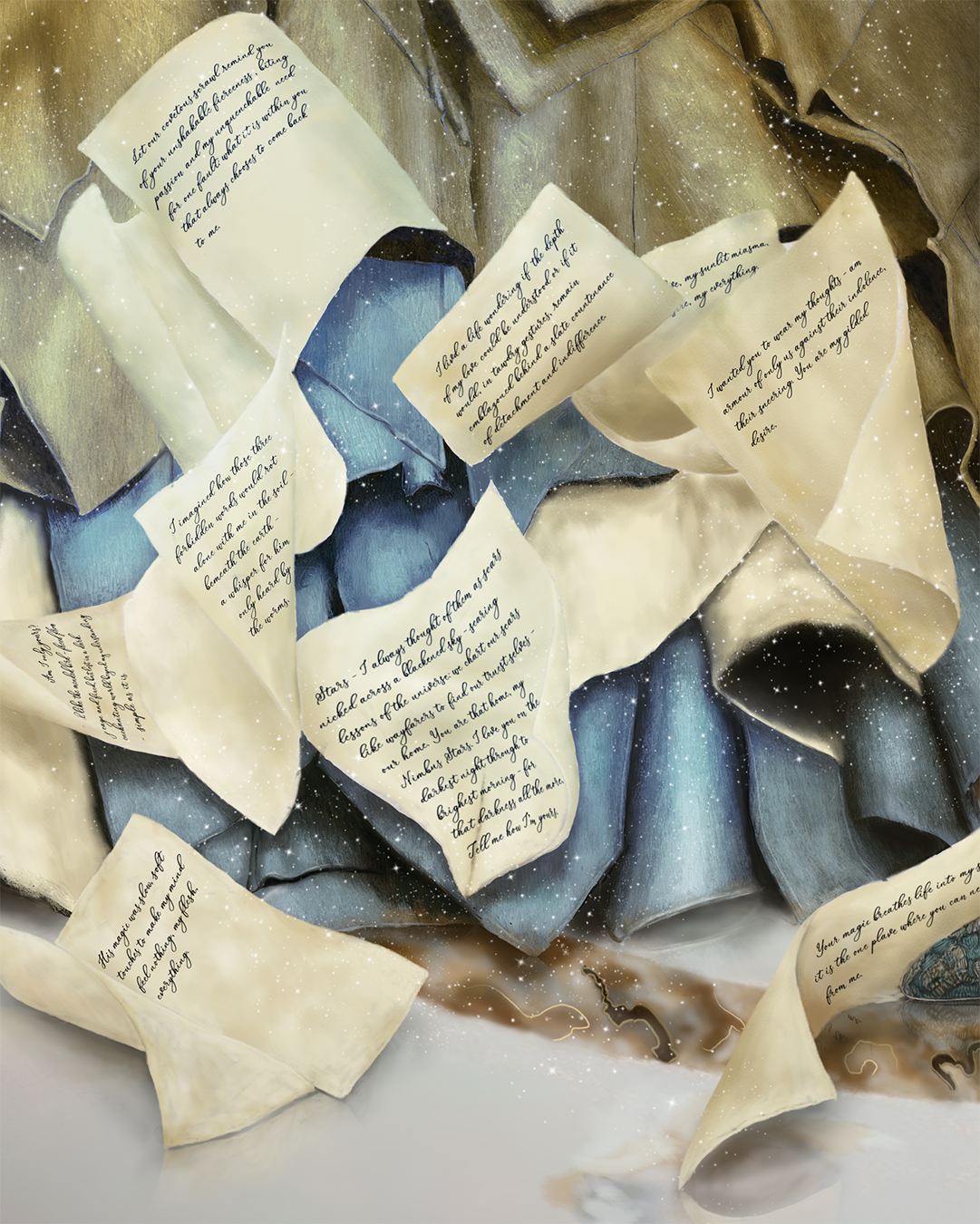 "His magic was slow, soft touches to make my mind feel nothing, my flesh, everything. The dress serenaded my skin: our letters a fabric—their whisperings words disquieted, entangled in the rustle of satin. My embossed scrawl glistened with his penned flourishes, abed on molten parchment that hummed against skin. Each gilded leaf hazed my thoughts—the sensation, an ambrosia that smeared all vision. The crush of silk fastened and belled to a golden gown, caging the cliff notes of our tale within."