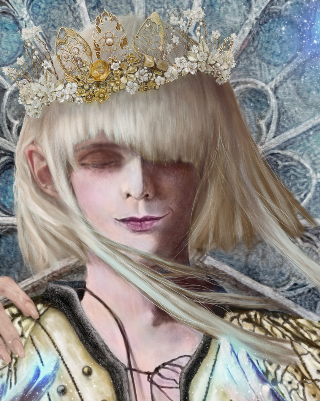 Medium: digital painting, using a UGEE S640 tablet, in Adobe Photoshop, on Grut Brushes Bellstone Art Surface, subsequently embellished with Austrian crystals