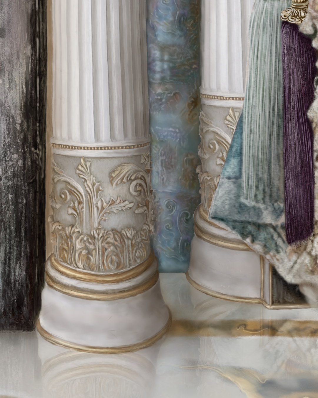 "Gilded Letters" is the fifth illustration from FAYBEL's dark romance fantasy narrative Timbretock: many paintings from this collection have been scheduled for magazine/book publication and are award winning. In "Gilded Letters", the Alchemist transmutes written correspondence shared between himself and the female main character, Miyako, into gilded leaves of satin in a Cinderella-inspired fairytale moment.