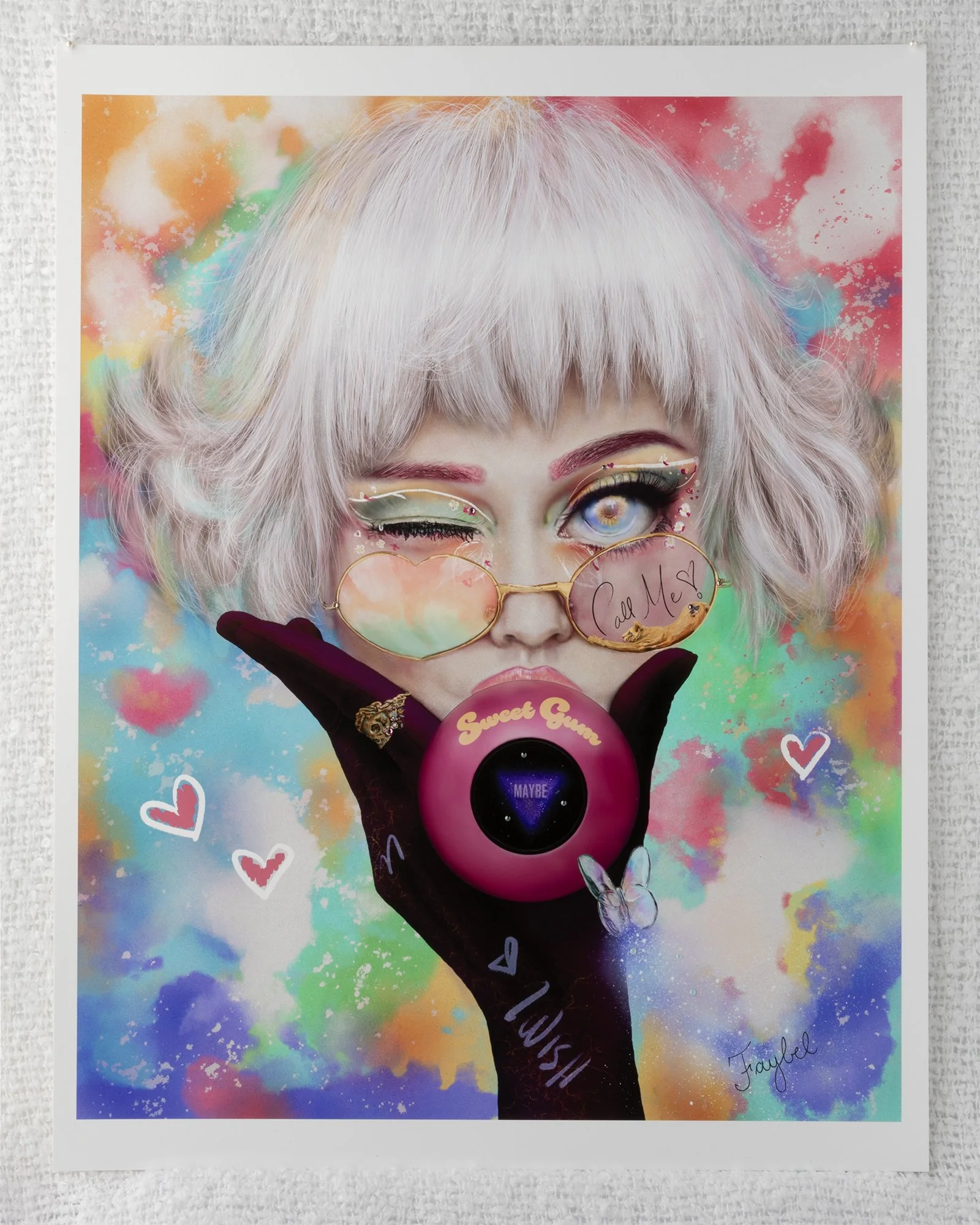 Sherbet-hued, gold-fringed spectacles are penned with the provocative whim, “Call Me!” A feline ‘catcall’ figure extends, stretching languidly into the curve of gilded-rim glasses, as their fae, Posy, blows a blush bubble of Sweet Gum, a charmed, magic eight-ball treat that answers the question of the chewer. The fates figure the future here—the occurrence of a clandestine affair between one frivolous fae, Posy, and the viewer who catches her sunny sunflower-eye—to be a quizzical, “MAYBE”—an elusive ‘just might’.